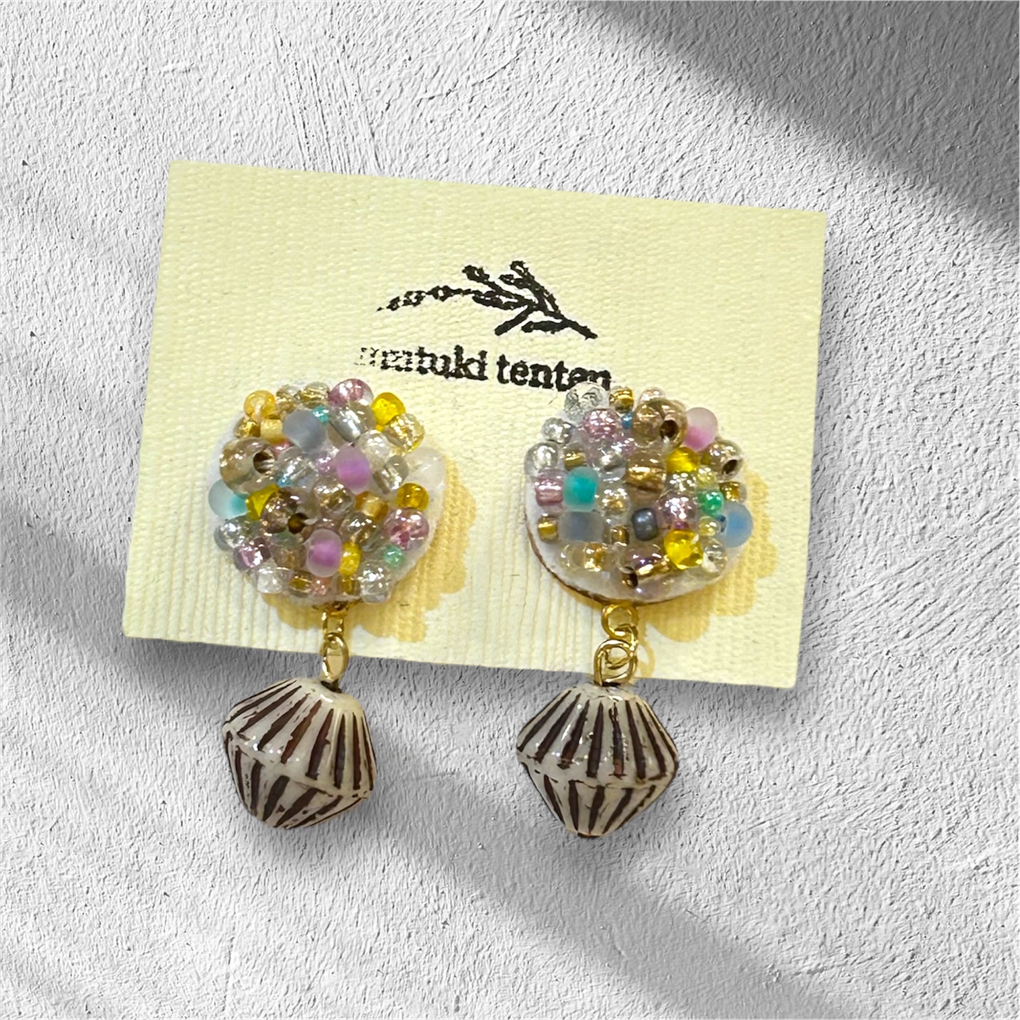 手作りの温かみが感じられるユニークなデザインが特徴です。美しいビーズ刺繍とそろばんのようなパーツで遊び心あふれるスタイルを演出します。カジュアルな日常使いだけでなく、特別な日のコーディネートにも幅広くご利用いただけます。ビーズの輝きが耳元で揺れるたびに、視線を集めること間違いなし。ハンドメイドの一点ものです。