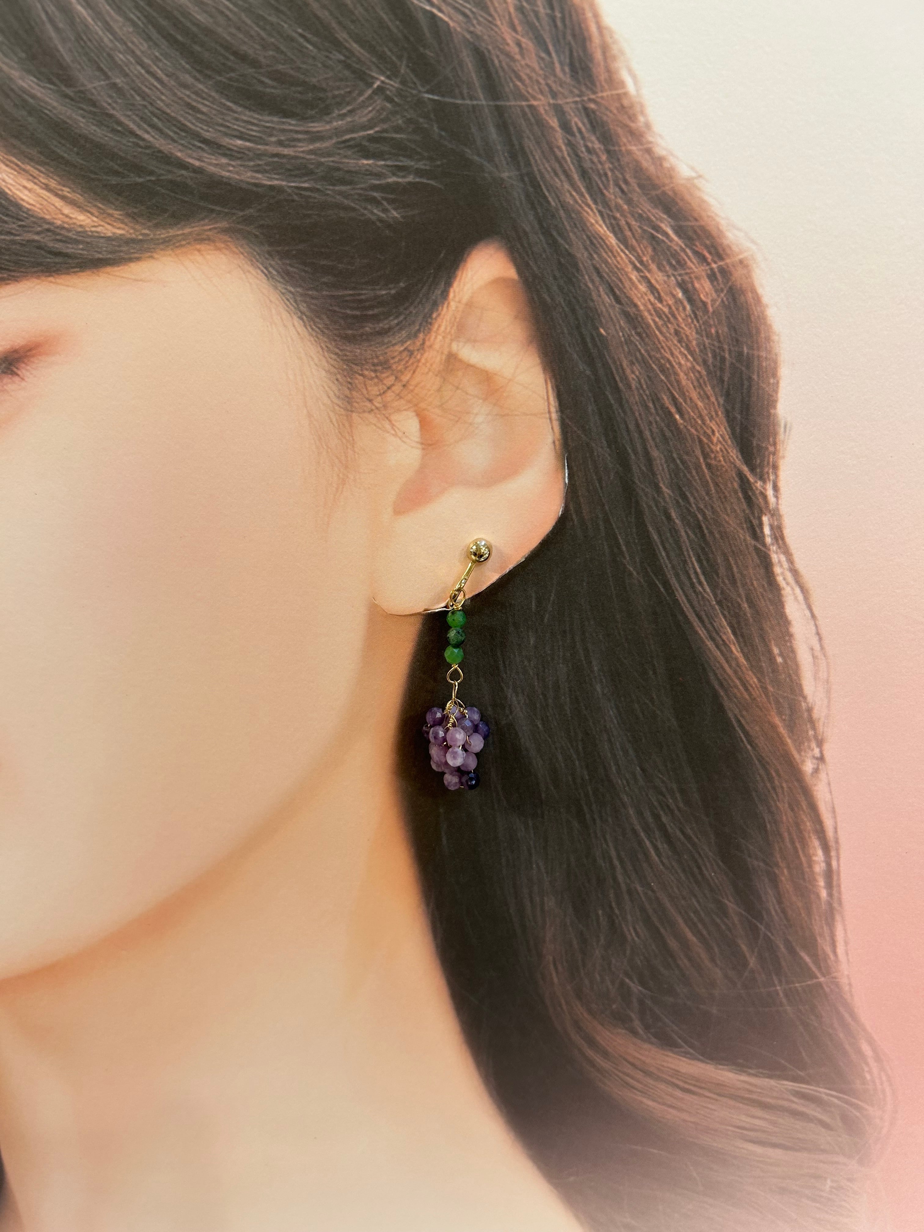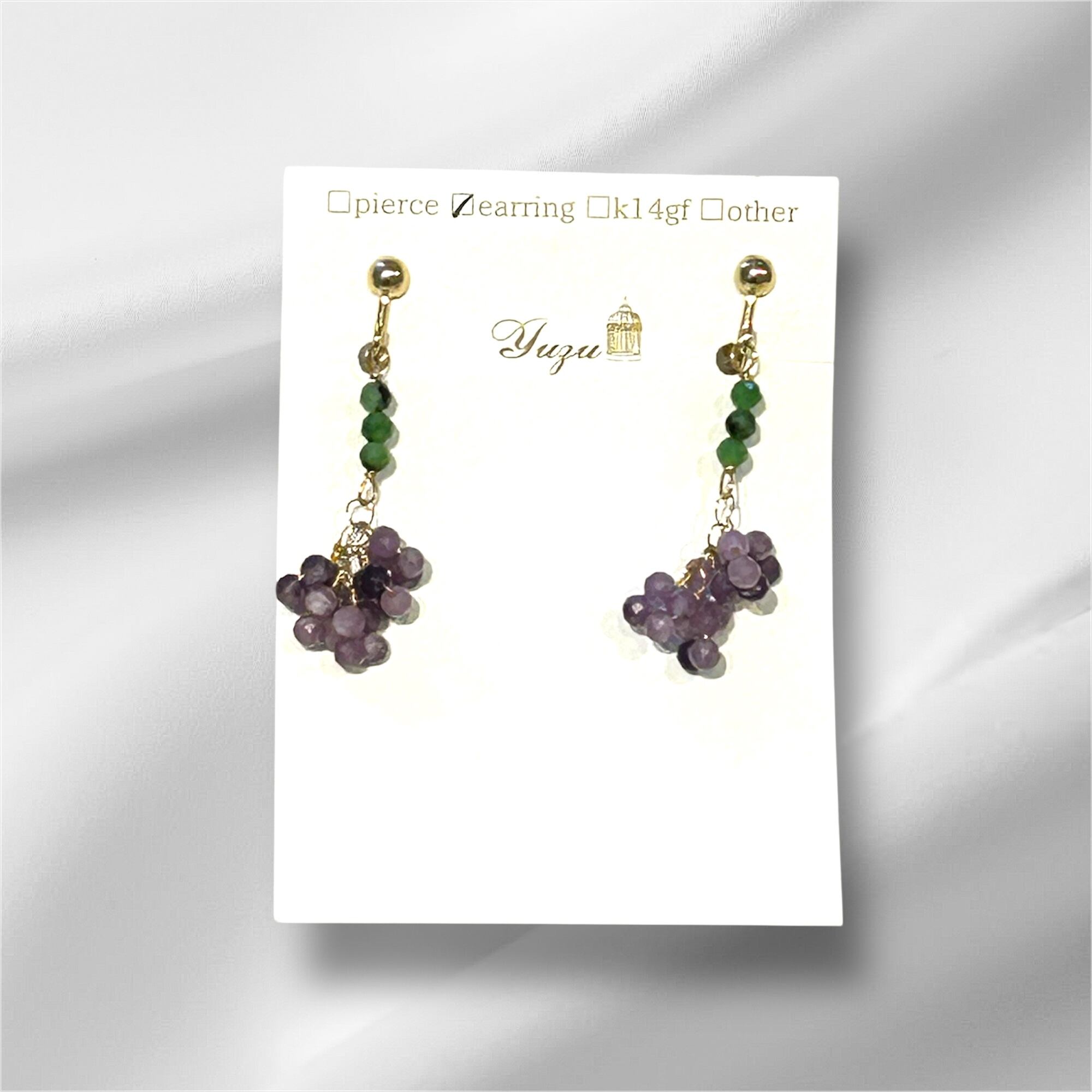 手作りの温もりが感じられる葡萄みたいな天然石イヤリングです。鮮やかな色合いとユニークな形状が耳元を華やかに演出します。カジュアルなお出かけから特別な日まで、幅広いシーンで活躍するアイテムです。