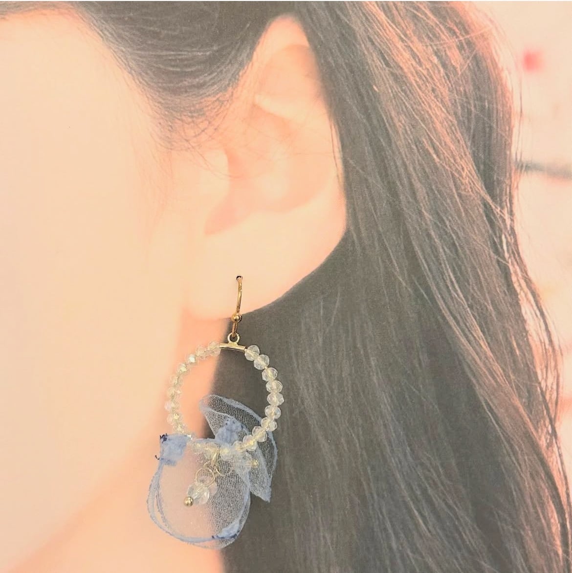 手作りの温もりを感じられるドットフラワーレースとエレガントなガラスフープの組み合せが素敵なイヤリングです。柔らかな花びらのようなレースが耳元を華やかに演出します。デニムスタイルにも馴染むさわやかなブルー。優雅なデザインが印象的なアクセサリーです。