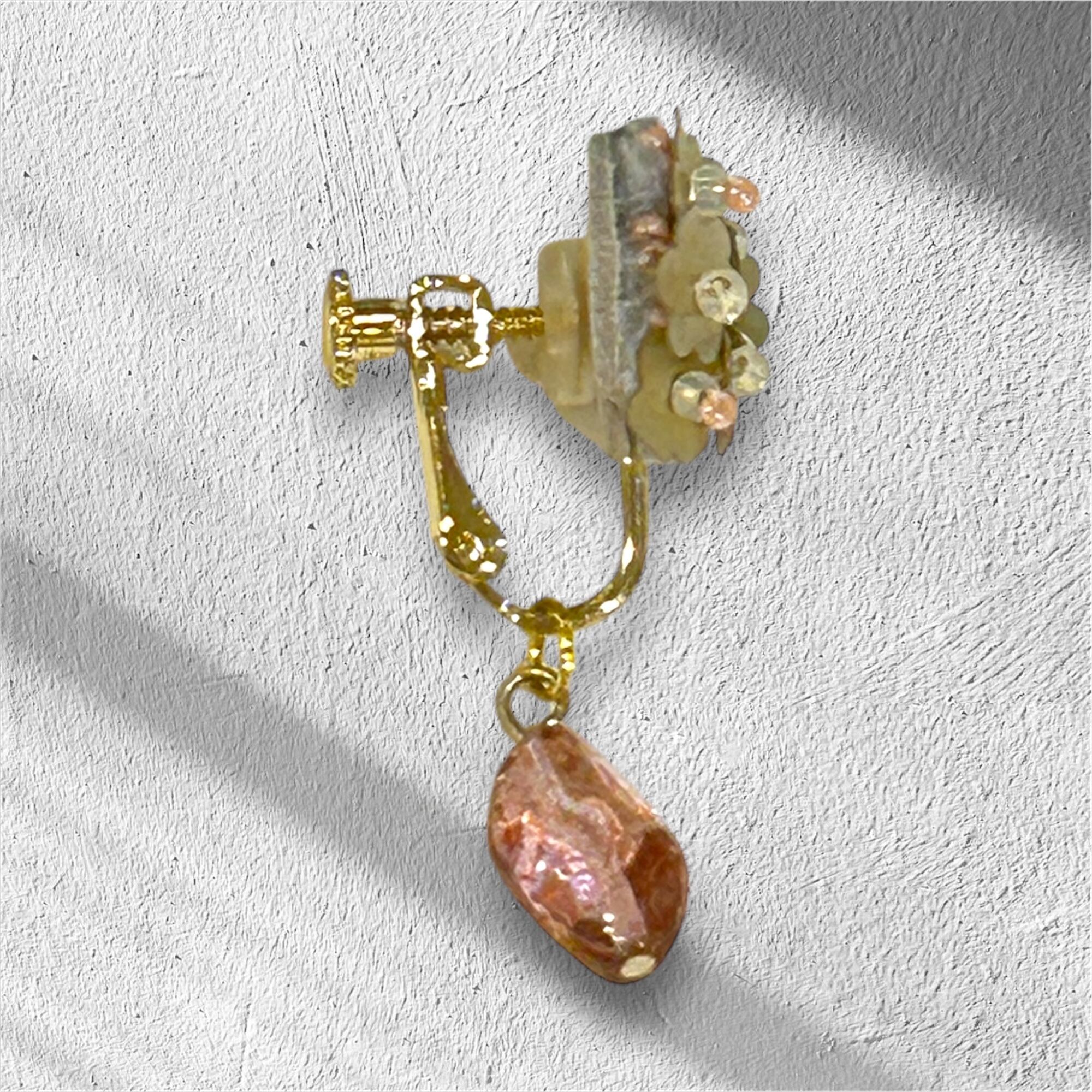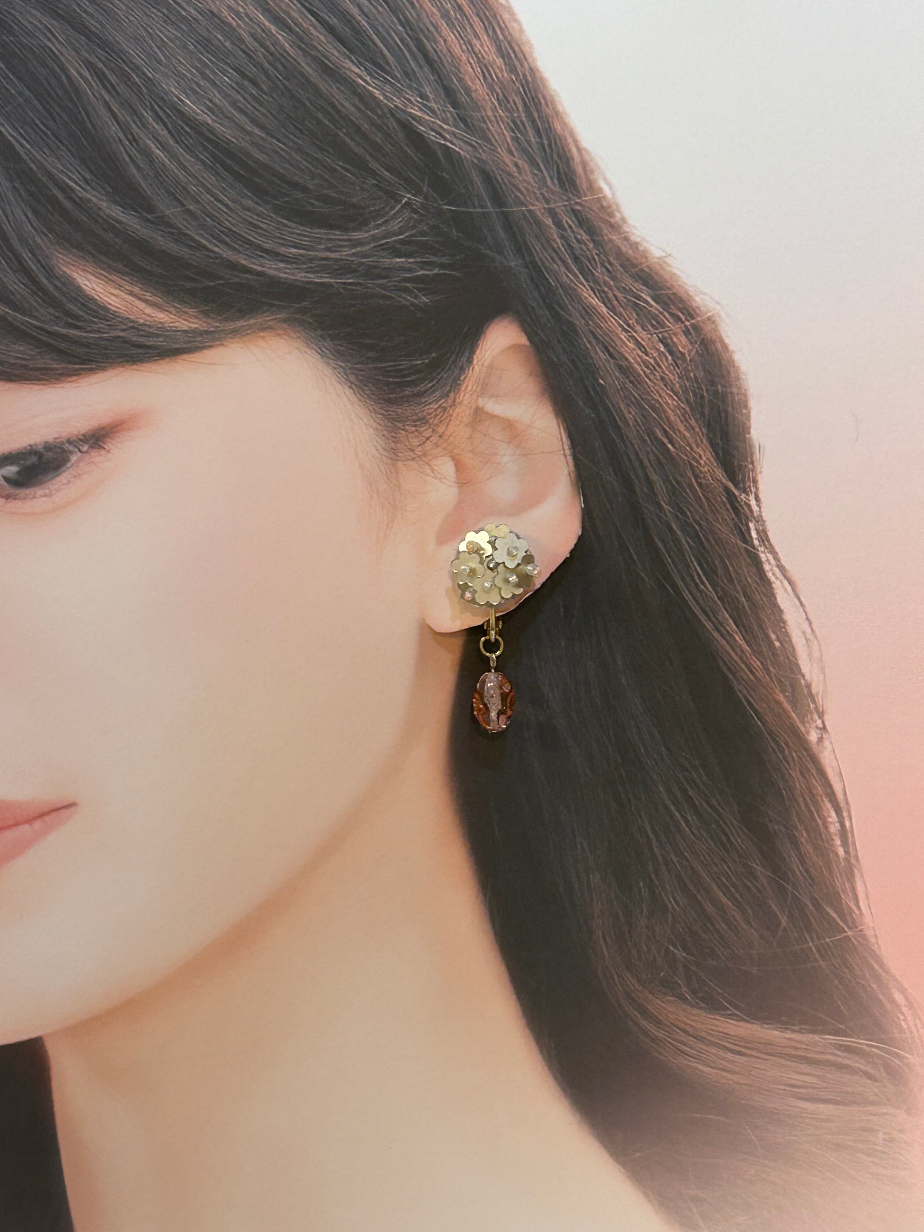 手作りの温もりが感じられるメタルスパンコールとガラスビーズのイヤリングです。ちょっ辛口なメタルスパンコールとピンクのガラスビーズの相性が絶妙な個性派イヤリング。一点もののオリジナリティをお楽しみください。